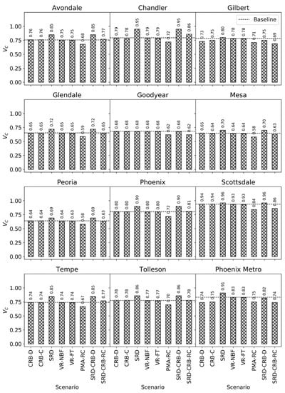 Phoenix SRVC model results show modest vulnerability differences between cities and between scenarios (Figure 5). Some scenarios yield minor changes in vulnerability (CRB-D, CRB-C), some scenarios yield increased vulnerability for all municipalities (SRD, SRD-CRB-D), one scenario decreases vulnerability for all municipalities (PMA-RC), and one scenario produces strong increases and strong decreases in vulnerability for different municipalities (SRD-CRB-RC). On a scale from zero to one, a change in vulnerability of +/− 0.10 is large in absolute terms and represents a water buffer of approximately 123,348 ML year−1. These differences are smaller in relative terms than the differences in sustainability and resilience shown in earlier sections. Municipalities with CAP-dominant water portfolios were most affected by scenarios CRB-D, CRB-C, SRD-CRB-D, and SRD-CRB-RC. Conversely, SRP-dominant water portfolios were most affected by scenarios SRD, and SRD-CRB-D, and SRD-CRB-RC. Importantly, municipal conservation as a response to mandated water curtailments, for most municipalities, soften the impact of water curtailments and reduced vulnerability to water stress. The Supplemental Information contains a full table of vulnerability results (Table S8).