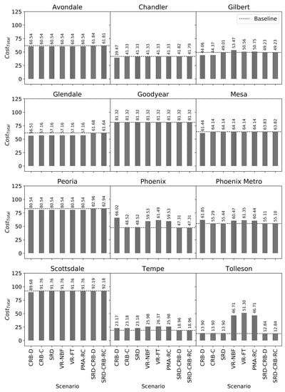 Cost in the Water SRVC model is the cost of bringing water supplies online for adaptation and to cover . These adaptive water supply costs include capital costs (or water prices), legal costs, operational costs, and infrastructure construction. Therefore, adaptive cost is the delta between existing costs and the levelized costs of adaptive options at an annual timeframe (Equation (6)). To calculate the cost of adaptation, we compute volumetrically weighted average costs of all water sources used by the municipality under the scenario. We assumed that each municipality would purchase the least expensive available water source per unit volume until exhaustion and then purchase the next least expensive water source, and so forth. The baseline cost of each municipality’s water portfolio is based on SRP surface water, CAP surface water, and groundwater cost data. Baseline per unit water costs varied drastically due to unique contractual conditions for each municipality’s water resources portfolio. Adaptive cost data to cover structural water deficits is based on Phoenix Active Management Area (AMA) water market data [].