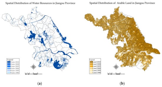 Water resources and arable land in Jiangsu Province: (a) Spatial distribution of water resources in Jiangsu Province; (b) Spatial distribution of arable land in Jiangsu Province.
