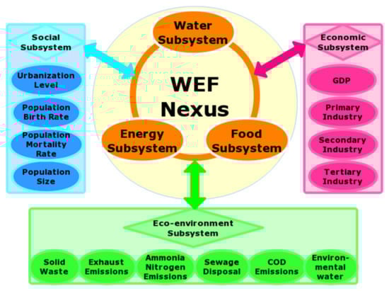 In recent years, the concept of the water–energy–food nexus has been continuously enriched, and research into this nexus has gradually deepened. Many noted practical nexus modelling tools have been proposed, such as the water supply model, power generation and environment (WPE) model, agent-based modeling (ABM) framework, and water–energy–food (WEF) nexus simulation optimization (WEFSiM-opt) model [14,15,16]. Current research on the WEF nexus is generally conducted in terms of efficiency analysis, coordinated development, risk control, and sustainable development assessment. With respect to efficiency analysis, the structural path analysis method and data envelopment analysis method were used to study the input–output efficiency of the WEF nexus to improve the efficiency of resource utilization [17,18]. With respect to coordinated development, analysis of the coupling and coordination degrees of the WEF nexus was carried out to measure the level of coordinated development of the WEF nexus, thereby optimizing its coordinated development capability and enhancing the coordinated security guarantee capability [19,20,21]. With respect to risk regulation, technologies such as remote sensing and integrated resource management were used in safety and risk prevention of the WEF nexus to enhance its risk management and control capabilities [22]. With respect to sustainable development assessment, a step-by-step methodological approach was proposed for sustainability assessment [23].