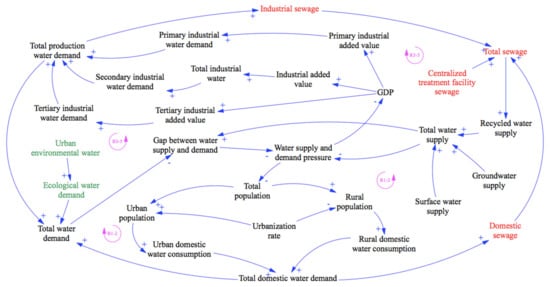 As the core system of the research model, the water resource subsystem is composed of two parts: water supply and water demand. With respect to water demand, the demand for water resources is divided into production water, ecological water, and domestic water. With respect to water supply, available water resources come from the local surface water supply, groundwater supply, and recycled water supply. All in all, the water subsystem specifically reflects the dynamic balance of water resources through the close relationship between total water demand and total water supply. The causal loop diagram of the specific water subsystem is shown in Figure 3. The external social, economic, and eco-environment subsystems are also included in it. To be specific, the main social factor that affects the WEF nexus is total population, and the main economic factor is gross domestic product (GDP). Furthermore, the eco-environmental subsystem mainly consists of two aspects: ecological water demand and water pollution. Figure 3 illustrates the situation of domestic water consumption (B1, B2) and production water consumption (B3–B5). In addition, Figure 3 shows the circulation process of water resources in the social–eco-environmental coupling system (R1, R2) and the economic–eco-environmental coupling system (R3–R5).
