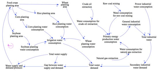 The energy subsystem selects primary energy and power energy as the research objects and main elements of this subsystem. Primary energy is specifically divided into raw coal, crude oil, and natural gas, and primary energy production water is classified into general industrial production water, which constitutes industrial water, and power industry water. The causal loop diagram of the specific energy subsystem is shown in the right half of Figure 4, which delineates the mechanism of water use in the energy subsystem.