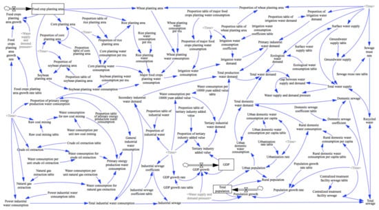 Then, the system dynamics model of the WEF nexus was built with the system dynamics Vensim software. Fully considering the internal correlation of the WEF nexus and combining the factors related to water resources in the external social subsystem, economic subsystem, and eco-environmental subsystem, the water subsystem was selected as the model core, and then the stock and flow diagram of the WEF nexus was created by integrating and modifying the above-mentioned subsystems, which not only show the type and property of each variable, but also show the specific situation of each variable changing over time. The specific stock and flow diagram is shown in Figure 5.