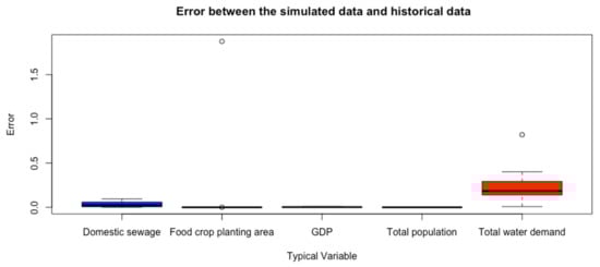 A historical examination of the WEF nexus SD model was performed by comparing simulated data in the Vensim software with historical data to verify the coincidence of the WEF nexus SD model and the real system. During this examination, five typical variables were selected as historical inspection indicators of the model, and historical data from 2010 to 2018 were selected to perform the historical examination. Then, the error between the simulated data and historical data of each typical variable was calculated. The calculation formula of the error was as follows: