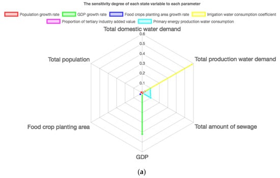 Sensitivity degree analysis is an important method to verify the validity of a model, and a model with good stability and effectiveness should have a low sensitivity degree. Sensitivity analysis of the WEF nexus SD model was completed to analyze the impact of parameter changes on the output of the model state variables by adjusting the parameters in this model. The calculation formula of the sensitivity degree is as follows [36]: