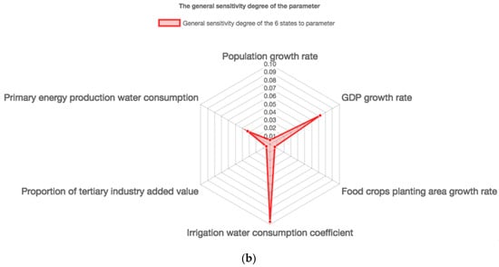 This study selected six parameters and six state variables from the WEF nexus SD model, and then analyzed them according to the method that each parameter was increased by 10% each time to analyze its impact on the sixvariables. Specifically, the sensitivity degree of each state variable to six parameters was calculated according to Equation (11). Then, the average sensitivity degree of each parameter was separately calculated according to Equation (12). The sensitivity degree analyses result is shown in Figure 7. From this figure, it can be seen that the sensitivity degrees of all parameters are lower than 10% or even lower than 1%, which shows that the WEF nexus SD model has a low sensitivity degree to most of the parameters, and the SD model has a strong stability.