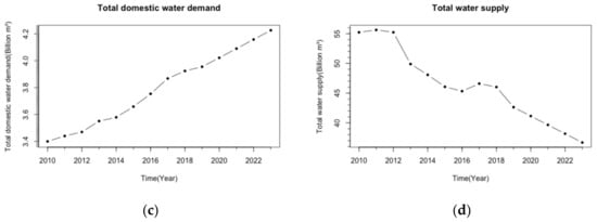 Scenario 1 simulation results: (a) Trend of irrigation water demand; (b) Trend of total industrial water consumption; (c) Trend of total domestic water demand; (d) Trend of total water supply.