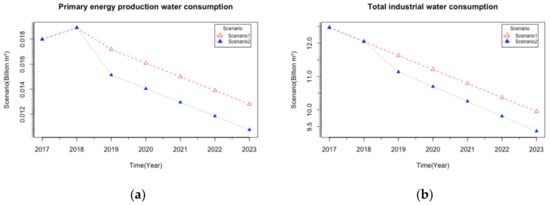 Scenario 2 simulation results: (a) Trend of primary energy production water consumption; (b) Trend of total industrial water consumption.