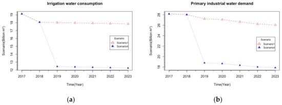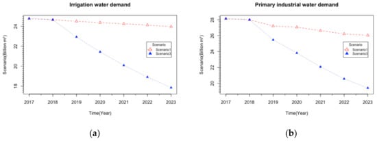 Scenario 4 simulation results: (a) Trend of irrigation water consumption; (b) Trend of primary industrial water demand.
