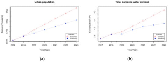 Scenario 5 simulation results: (a) Trend of urban population; (b) Trend of total domestic water demand.