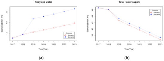 The expected ultimate purpose of this scenario was to increase the supply of water resources and enhance the supply capacity of water resources, the methods of which include improving the capacity of natural water resources development and utilization, improving the sewage reuse rate, and so on. Considering the availability of data, this scenario selected the sewage reuse rate as the decision variable for regulating and controlling the recycled water supply. Furthermore, this scenario increased the supply of water resources by converting more domestic sewage and industrial sewage to water that meets certain quality standards and can be used at certain occasions. With respect to the data processing, this scenario referred to the data from the “Thirteenth Five-Year Plan for National Urban Sewage Treatment and Recycling Facilities Construction Plan”, which set the following goals: The water utilization rate of the Beijing-Tianjin-Hebei area is not less than 30%, the water utilization rate of water-scarce cities is not less than 20%, and other cities and counties strive to reach 15%. According to the goals above, in this scenario, it was assumed that a sewage reuse rate of Jiangsu Province of not less than 30% can be reached in 2023. Therefore, this scenario’s data processing was as follows: The annual sewage reuse rate was increased by 10 percentage points based on the data of scenario 1 during the 5 years from 2019 to 2023. Then, the sewage reuse rate of Jiangsu Province in 2023 will reach 31.8217%, which will meet the hypothetical goal.