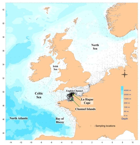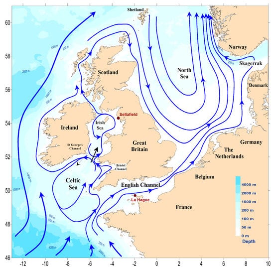 Oceanographic sampling campaigns made it possible to measure the dispersion of the artificial radionuclides remaining dissolved in seawater over the past 30 years. These works have demonstrated the interest of dissolved radionuclides as tools for oceanography [,,]. Over the European continental shelf, extensive in-situ measurements have been performed between 1950 and 2000 by English, German, Belgian and French institutes [,] that allowed to draw up the general circulation pathways and water masses transit times in the Irish Sea, the North Sea, the English Channel (Figure 1) and the Arctic ocean [,,,,,]. The Cherbourg Radioecology Laboratory (IRSN-LRC) has contributed to these studies at the scale of the English Channel and the North Sea since 1988 [,,,,,,,,,]. These works have been ongoing since 1994 in the North-East Atlantic waters, the Celtic Sea, Irish Sea and the Bay of Biscay. During the 1990s, it appears that dissolved radionuclide measurements represent exceptional tools to test and validate marine hydrodynamic models applied to represent short to long term dispersion processes.