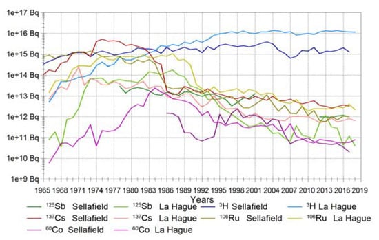 The releases database is available in [] as a Supplementary Materials for this work. Figure 2 presents the annual fluxes released by Sellafield and La Hague reprocessing plants for 125Sb, 137Cs, 106Ru and 60Co. It shows that the main release period for 125Sb, 3H, 137Cs, 106Ru and 60Co occurs before 1992, with a maximum for 137Cs between 1969 and 1983 at Sellafield (1–5 PBq·y−1), and for 106Ru between 1969 and 1991 at La Hague (close to 1 PBq·y−1). Tritium releases (in blue) show a more homogeneous temporal evolution, with fluxes in the same magnitude as Sellafield since 1969 (1–3 PBq·y−1) and since 1993 from La Hague (around 10 PBq·y−1). It depends mainly from the quantities of nuclear fuel processed by the plants.