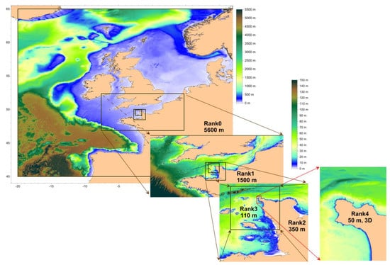 Example of model nesting for the La Hague Cape area, Ranks 0–2 are two-dimensional (2D), Rank3 is 2D or three-dimensional (3D), Rank4 is 3D, adapted from [].
