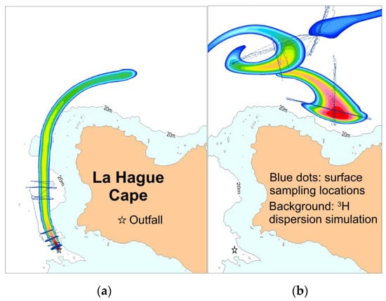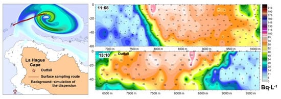 Due to the small amount of seawater required for direct measurement by liquid scintillation (8 mL) a large amount of samples can be processed that can be used to have a high frequency 2D picture or even a 3D picture of the tritium dispersion at a short scale close to the La Hague outfall (Section 2.4.1 and Section 2.4.2 [,]). The power plants labeling could be used in areas out of theses influences, with corresponding levels lower than 1 Bq·L−1, in the Bay of Biscay [] or in the Mediterranean Sea.