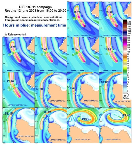 In the releases performed by nuclear reprocessing plants and French nuclear power plants, tritium is the form of the tritiated water molecule HTO; thus, it has a strict conservative behavior in seawater. This is not always the case: for example, the releases performed by the Amersham plant in Cardiff in the Bristol Channel concern organic compounds tagged with tritium. Organically bounded tritium (OBT) has a specific behavior in marine environment with strong assimilation by living species []. Due to their locations (mainly the Bristol Channel and Rhone River), these kinds of releases do not influence the results presented here.