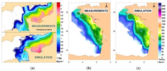 In the releases performed by nuclear reprocessing plants and French nuclear power plants, tritium is the form of the tritiated water molecule HTO; thus, it has a strict conservative behavior in seawater. This is not always the case: for example, the releases performed by the Amersham plant in Cardiff in the Bristol Channel concern organic compounds tagged with tritium. Organically bounded tritium (OBT) has a specific behavior in marine environment with strong assimilation by living species []. Due to their locations (mainly the Bristol Channel and Rhone River), these kinds of releases do not influence the results presented here.