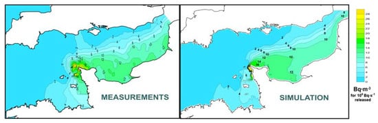 In the releases performed by nuclear reprocessing plants and French nuclear power plants, tritium is the form of the tritiated water molecule HTO; thus, it has a strict conservative behavior in seawater. This is not always the case: for example, the releases performed by the Amersham plant in Cardiff in the Bristol Channel concern organic compounds tagged with tritium. Organically bounded tritium (OBT) has a specific behavior in marine environment with strong assimilation by living species []. Due to their locations (mainly the Bristol Channel and Rhone River), these kinds of releases do not influence the results presented here.