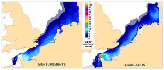 In the releases performed by nuclear reprocessing plants and French nuclear power plants, tritium is the form of the tritiated water molecule HTO; thus, it has a strict conservative behavior in seawater. This is not always the case: for example, the releases performed by the Amersham plant in Cardiff in the Bristol Channel concern organic compounds tagged with tritium. Organically bounded tritium (OBT) has a specific behavior in marine environment with strong assimilation by living species []. Due to their locations (mainly the Bristol Channel and Rhone River), these kinds of releases do not influence the results presented here.