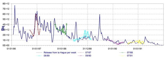 In the releases performed by nuclear reprocessing plants and French nuclear power plants, tritium is the form of the tritiated water molecule HTO; thus, it has a strict conservative behavior in seawater. This is not always the case: for example, the releases performed by the Amersham plant in Cardiff in the Bristol Channel concern organic compounds tagged with tritium. Organically bounded tritium (OBT) has a specific behavior in marine environment with strong assimilation by living species []. Due to their locations (mainly the Bristol Channel and Rhone River), these kinds of releases do not influence the results presented here.