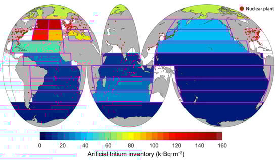 - Oms, P.-E.; Bailly du Bois, P.; Dumas, F.; Lazure, P.; Morillon, M.; Voiseux, C.; Le Corre, C.; Cossonnet, C.; Solier, L.; Morin, P. Inventory and distribution of tritium in the oceans in 2016. Sci. Total Environ. 2019, 656, 1289–1303. [Google Scholar] [CrossRef]