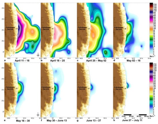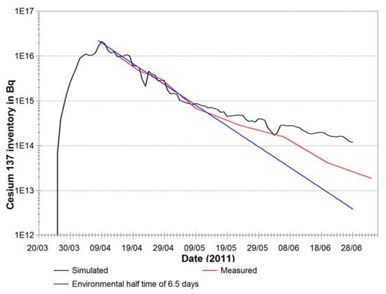 - Bailly du Bois, P.; Garreau, P.; Laguionie, P.; Korsakissok, I. Comparison between modelling and measurement of marine dispersion, environmental Half-Time and 137Cs inventories after the Fukushima Daiichi accident. Ocean Dyn. 2014, 64, 361–383. [Google Scholar] [CrossRef]