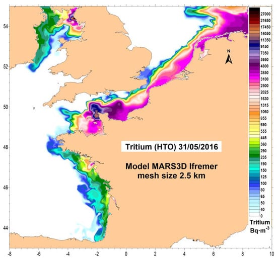 In the releases performed by nuclear reprocessing plants and French nuclear power plants, tritium is the form of the tritiated water molecule HTO; thus, it has a strict conservative behavior in seawater. This is not always the case: for example, the releases performed by the Amersham plant in Cardiff in the Bristol Channel concern organic compounds tagged with tritium. Organically bounded tritium (OBT) has a specific behavior in marine environment with strong assimilation by living species []. Due to their locations (mainly the Bristol Channel and Rhone River), these kinds of releases do not influence the results presented here.