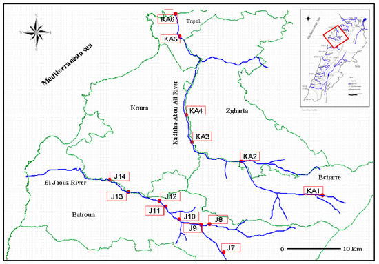Map of the Kadisha-Abou Ali and El Jaouz rivers. Red dots refer to the monitoring sites (KA1 to KA6 for Kadisha-Abou Ali River and J7 to J14 for El Jaouz River).