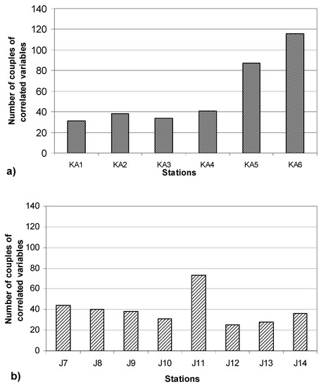 Number of couples of correlated variables with Pearson coefficient >0.5 for each station of the Kadisha Abou Ali (a) and El Jaouz (b) rivers.