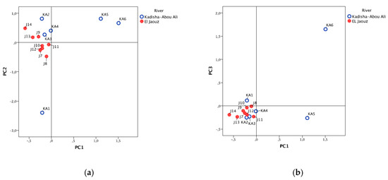 For all PC scores, the choice was to represent the barycenter of all the spatiotemporal data, which differentiates each site. The first PCA shows that the two rivers are well discriminated in the PC1-PC2 plot and, in particular, the sites KA1, KA5 and KA6 of the Kadisha-Abou Ali River (Figure 3a). The other sites of the same river (KA2, KA3 and KA4) are located close to those of the El Jaouz River, indicating that their water has relatively similar characteristics. Site KA6 is discriminated by strong organic characteristics, primarily related to the anthropogenic inputs of Tripoli but also by certain mineral parameters. These mineral characteristics cannot in this case be only linked to the watershed substrate. A considerable part comes from the anthropogenic inputs. Site KA5 has strong mineral characteristics probably also due to anthropogenic origins. This site has less pronounced organic characteristics than site KA6 but stronger than the other sites. That finding is partly due to the organic and mineral inputs of the industrial activities of the suburbs of Tripoli.
