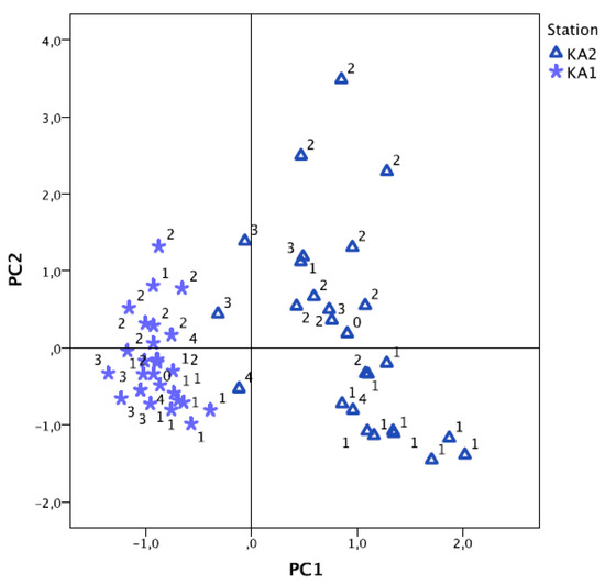 Scatter plot of scores during the study period, corresponding to the first two principal components for all stations excluding KA5 and KA6.