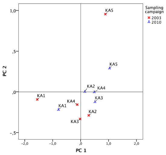 Scientists working in the field of surface water quality, by various means, can use this overlay of multivariate fingerprints. In fact, the position of samples in this plot can indicate whether their water quality changed over time, both positively or negatively. For instance, it can be noticed that even after 7 years, KA1 characteristics are still defined by relatively low mineral and low anthropogenic parameters, and can thus always be assigned as the “water mass reference,” for this river. However, the position of station KA5 moved considerably according to PC2, indicating a better water quality in 2010 compared to 2003, since anthropogenic parameters defining PC2 are less weighing in its discrimination.