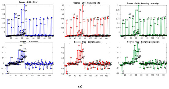 However, what is mostly important in this methodology resides in the scores plot (Figure 6), acting as the water quality fingerprint. A similar spatial distribution of samples is clearly noticed for the two sampling campaigns, where stations KA1 are well discriminated according to PC1 and stations KA5 according to PC2. Stations KA2, KA3 and KA4 are still clustered around the center, indicating that they have similar and average characteristics.