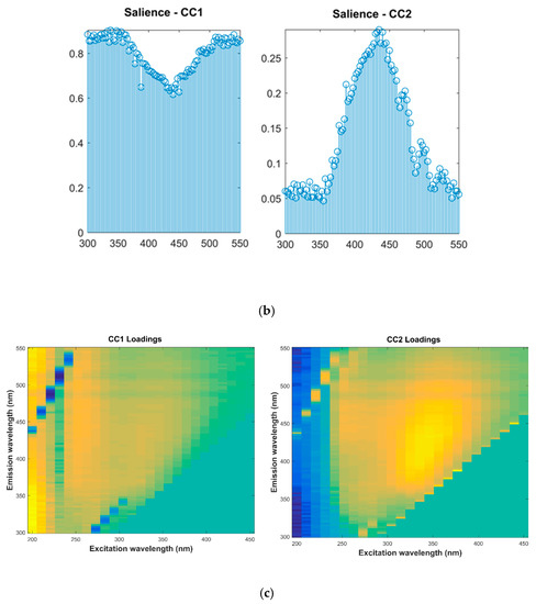 ComDim is a particular implementation of the “Common Components and Specific Weights Analysis” (CCSWA) procedure [27,28,29]. ComDim determines a common space describing the dispersion among data sets or blocks through sample scores; each block having a specific weight or “salience” associated with each dimension in this common space, the Common Components (CCs). Significant differences in the values of saliences for a given dimension reflect the fact that the dimension contains different amounts of information from each block. In addition, and for each CC, the ComDim procedure calculates the loadings of the variables in each block, enabling further interpretation of the highlighted discriminations [28]. Here, ComDim was applied on the 3D array (173 samples × 25 excitation wavelengths × 101 emission wavelengths), which was treated as 101 blocks or matrices corresponding to the emission wavelengths. The 173 samples corresponded to the 14 sampling locations along Kadisha-Abou Ali and El Jaouz rivers, sampled between July and February, thus covering 14 sampling campaigns.