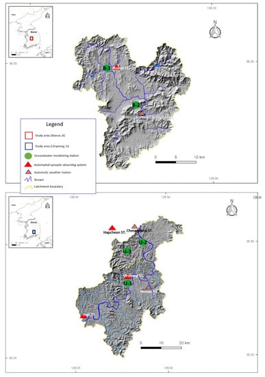 Locations of the study sites, indicating the river basin boundaries and the monitoring stations: Boeun (above) and Uiryeong (below) areas, respectively, in South Korea.