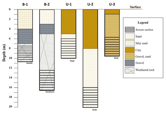 We applied the ARC method to five groundwater monitoring wells in Boeun, Chungcheong Province, and Uiryeong, Gyeongsang Province, South Korea (Figure 1). Groundwater monitoring stations B-1 and B-2 were located in Boeun, in a sub-basin of the Geum River basin in the Bocheongcheon watershed (36°21′–36°33′ N, 127°37′–127°56′ E). The terrain was mainly mountainous, with flatter areas to the west. The catchment area was approximately 553 km2 and the average elevation was 264 m (maximum elevation: 1057 m) (Water Management Information System, WAMIS, http://www.wamis.go.kr). The river basin contains 12 streams and the population was approximately 34,000 in 2015. The geology of the watershed consists mainly of Daebo granite of Jurassic age (Korea Institute of Geoscience and Mineral Resources, KIGAM, http://mgeo.kigam.re.kr). The U-1, U-2, and U-3 groundwater monitoring stations were located in Uiryeong, in a sub-basin of the Nakdong River basin in the Namgang watershed (35°01′–35°37′ N, 128°00′–128°35′ E). The catchment area was approximately 1685 km2 and the average elevation was 128 m (maximum elevation: ~895 m) (WAMIS, http://www.wamis.go.kr). The river basin contains 123 streams and the population was approximately 435,000 in 2015. The geology of the Namgang watershed consists mainly of igneous and metamorphic rocks (KIGAM, http://mgeo.kigam.re.kr). Lithologic logs for each site are shown in Figure 2. Wells B-1 and B-2 were covered by a sandy gravel layer, whereas wells U-1, U-2, and U-3 had low-permeability clay layers at about 5, 8, and 1 m from the surface, respectively.