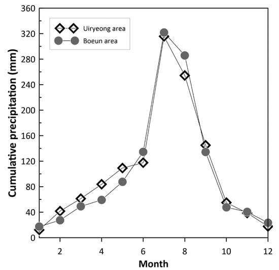 Monthly cumulative precipitation at the two study areas (Boeun and Uiryeong, South Korea).