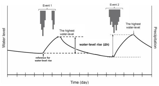 Step 2: The determination of the groundwater level rise due to a rainfall event. After the precipitation events were identified, groundwater level rises due to precipitation recharge were calculated by subtracting the lowest groundwater level after the event began from the highest level recorded during the 48 h following the end of the precipitation event. The delay time was based on the results of correlation analysis in the previous study [40], which used daily precipitation and daily mean water-level for 3–5 years.