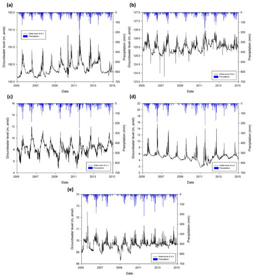 Relationships between the precipitation and the groundwater level at (a) B-1, (b) B-2, (c) U-1, (d) U-2, and (e) U-3 during the period 2005–2014.