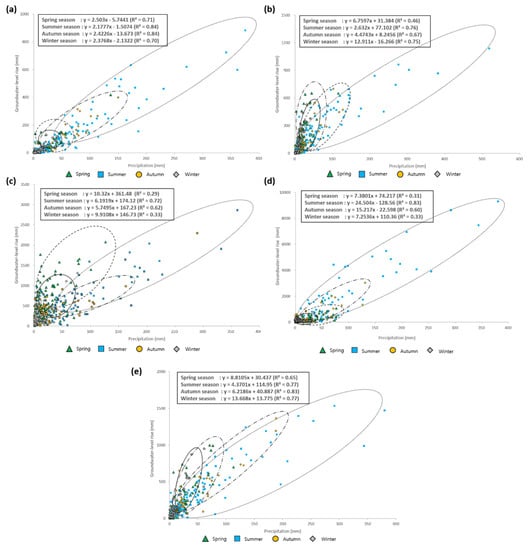 The slope of the relationship between the groundwater level rise and the total precipitation during rainfall events from 2005 to 2014 was used to determine the ARC (Figure 6). Seasonal linear trends were calculated using best-fit lines and their variability was determined using the correlation coefficient (R2). The average R2 values of the five wells ranged from 0.29 to 0.84 for the 10 year study period, at 0.78, 0.71, 0.48, and 0.58 for summer, autumn, spring, and winter, respectively (p < 0.05, Figure 6; Table 2).