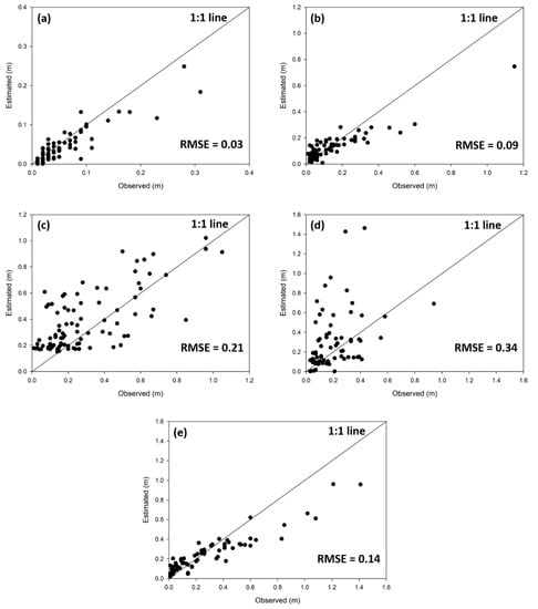 Estimated and observed groundwater level rise at the monitoring wells (a) B-1, (b) B-2, (c) U-1, (d) U-2, and (e) U-3 determined using the groundwater level and the precipitation time series data for 2015–2016 to validate the linear regression of groundwater level rise and precipitation.