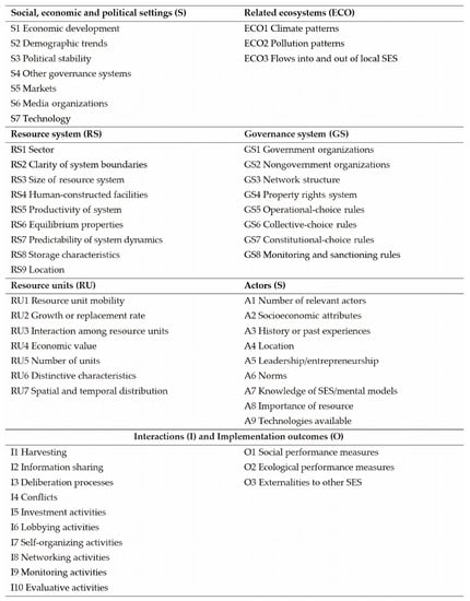 The SES framework has had modifications and innovations to validate its application in different fields. From the beginning, Ostrom used the institutional and development analysis (IAD) framework [,], based on politic processes analysis such as social, institutional and biophysics systems []; however, for decades, investigators have empirically identified a list of variables that affect the development of governance on multiple systems. In such a way, the SES framework builds on the IAD framework [].