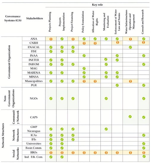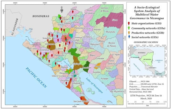 We started by identifying the actors in the governance system that are engaged in water management by studying the provisions of the Nicaraguan Water Law [], which created new government institutions and binding network structures at the national and local levels. We created a list of key stakeholders within various organizations as primary sources of information for data collection and to aid in the application of the SES framework [,].