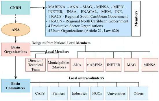 The relevant actors are seen in a negative light due to a lack of technical knowledge, expertise and innovation, the opinions of citizens being only partially integrated, a lack of willingness among citizens, the execution of projects without strategic planning, and a lack of knowledge about legal frameworks and policy instruments. Finally, local networks and organizations do not have the appropriate technology to monitor water resources or coordinate efforts in river basins, since the promotion and integration of this area (water management) has received significantly less attention or emphasize compared to other institutional approaches [,] which address to organizational priorities. The Nicaraguan Water Law was designed as a multilevel water governance scheme, in which the ANA is the highest national-level authority, with regulatory and supervisory functions over the RBOs, which play a similar role at the local level []. It would be useful to have RBOs in place, because then water users could access their rights under the law within a short distance of their communities.