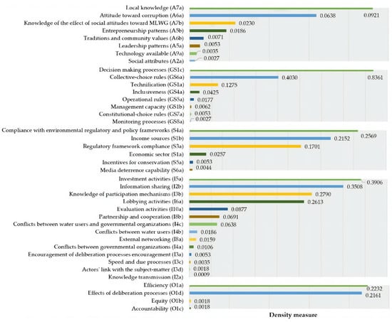 As we emphasized in Section 2.3, although 52% of interviewees are local government officers, the remaining belong to multiple network structures; nevertheless, this ratio does not make a sound difference in the relationship between observed variables density value and the underlying concepts of multilevel water governance. Furthermore, differences were taken into account when placing the observed data from third-tier variables and combining them into aggregate water governance variables, as stated in Figure 5. In order to distinguish between variables in this dimension, the descriptive statistics of density works as a relative indicator of activeness and a measure of connectivity for variables according to responses. By the application of density measure, it was possible to range third-tier variables of the SES framework from 0.0009 to 0.8365. Nevertheless, we divided these variables into five-way classification, corresponding to second-tier concepts.