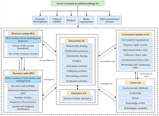 Regarding governance subsystems, the rules defining actions, mechanisms, and processes and their relationships to multilevel water governance are defined by socioeconomic characteristics, leadership and entrepreneurship patterns, understanding of SES components and interaction effects, and the water management technology available.