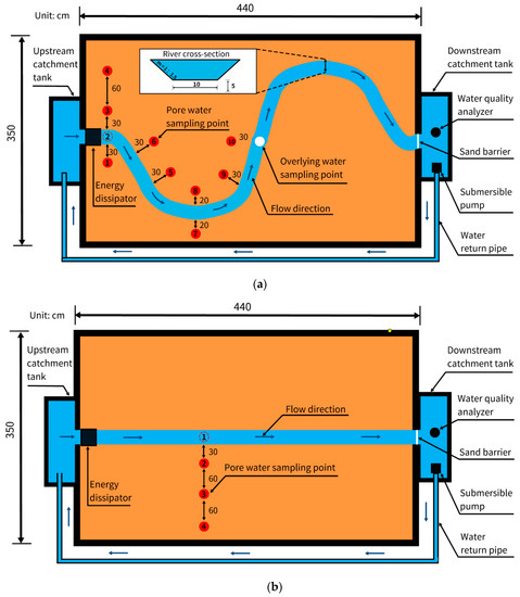 To study the correlation between river sinuosity and water quality, our team selected the Shiwuli River in Hefei, China, as the research object and used a field monitoring method to analyze the relationship between the pollutant concentration reduction ratio and the river sinuosity in river sections with different sinuosities. The results showed that in natural rivers, sinuosity has different degrees of positive correlation with the growth rate of DO and the reduction ratios of total nitrogen (TN), ammonia N, and total phosphorus, of which nitrogen is most significantly correlated with river sinuosity [16]. However, natural river channels are irregular, and field monitoring cannot accurately control the flow, water level, and temperature, nor can this method accurately measure and test indicators such as groundwater concentration and hyporheic exchange within the river substrate in a short time, making it difficult to explore the strength of the effect of sinuosity on water quality changes in riverine systems [17]. After building a laboratory simulation channel, Cai [18] found that changes in river morphology affected the phosphorus concentration in a river, but that research did not explore the spatiotemporal distribution of river pollutants.
