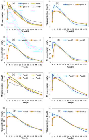 Points 5 and 6 were located on the upstream side of the convex bank, while points 9 and 10 were located on the downstream side of the convex bank. Figure 3c,d,g,h,k, and l shows that in the first stage of the tests, the TN concentration in pore water increased at all points. The TN concentrations at points 5 and 6 rose to their maximums, which were relatively high, within a short time, approximately 1 h after the test started. In contrast, the upward trends at points 9 and 10 were relatively delayed, as the nitrogen concentration reached the maximum level 4 h after the test started, and the maximum value was smaller than the peak value on the upstream side. These findings indicate that the effect of TN accumulation on the upstream side of the convex bank was stronger than that on the downstream side of the same bank. On the one hand, this result occurred because after the test started, the polluted water first passed through the upstream section and was filtered and diluted by the upstream side before flowing to the downstream side, resulting in an inherently lower concentration of polluted water absorbed by the sandy soil on the downstream side. On the other hand, the upstream side of the convex bank directly faced the incoming water flow, so more polluted water was pressed into the upstream substrate through the higher flow, resulting in a higher concentration. On the downstream side, the polluted water was only absorbed through milder hydraulic infiltration, resulting in a lower concentration. After the peak TN was reached, the trends of decreasing concentration at different points became consistent due to the more even mixing of the water body and the stability of the longitudinal hyporheic exchange [25].
