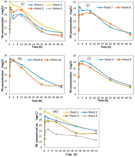 Variation in TN concentration in pore water in the test sets with sinuosities of 2.2 (a–d), 1.8 (e–h), 1.4 (i–l), and 1.0 (m).
