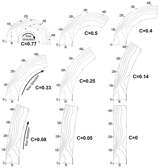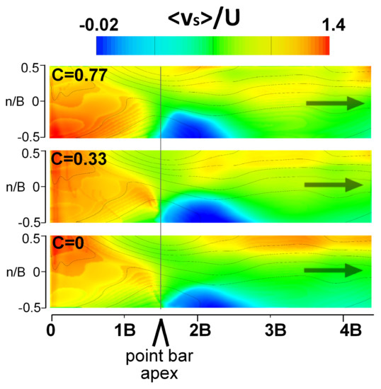 The streamwise velocity distributions, quantified by the first moment of depth-averaged streamwise velocity <vs>/U, had spatially varying sensitivity to curvature, which was most pronounced at the channel inlet (Figure 7). In the inlet the maximum was along the right bank in C = 0.77 but was along the left bank in C = 0. These differences in streamwise velocity are explained by curvature and its role in transverse velocity gradients. In C = 0.77 the shorter streamwise distance along the inner bank caused an increase in <vs>/U from the inner bank to the outer bank [30]. Curvature also caused differences in magnitude of <vs>/U between the C = 0.77 and C = 0 channels from 2.5 s/B to 4 s/B, with the maximum <vs>/U increased and concentrated near the outer bank area.